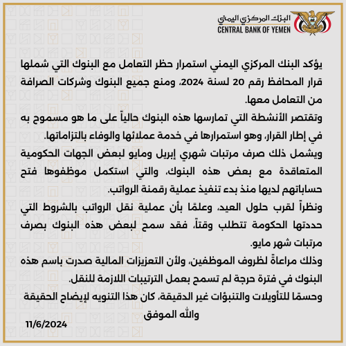 أكد البنك المركزي اليمني، استمرار حظر التعامل مع بعض البنوك مع استثناء صرف مرتبات إبريل ومايو لبعض الجهات الحكومية.