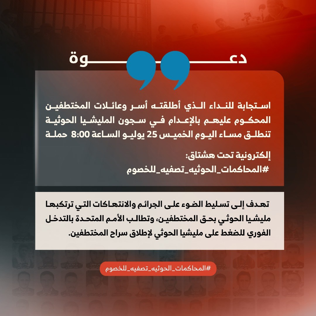 استجابةً للنداء الذي أطلقته أسر وعائلات المختطفين المحكوم عليهم بالإعدام في سجون المليشيا الحوثية، انطلقت مساء الخميس 25 يوليو الساعة 8:00 حملة إلكترونية تحت هاشتاق: #المحاكمات_الحوثية_تصفية_للخصوم.