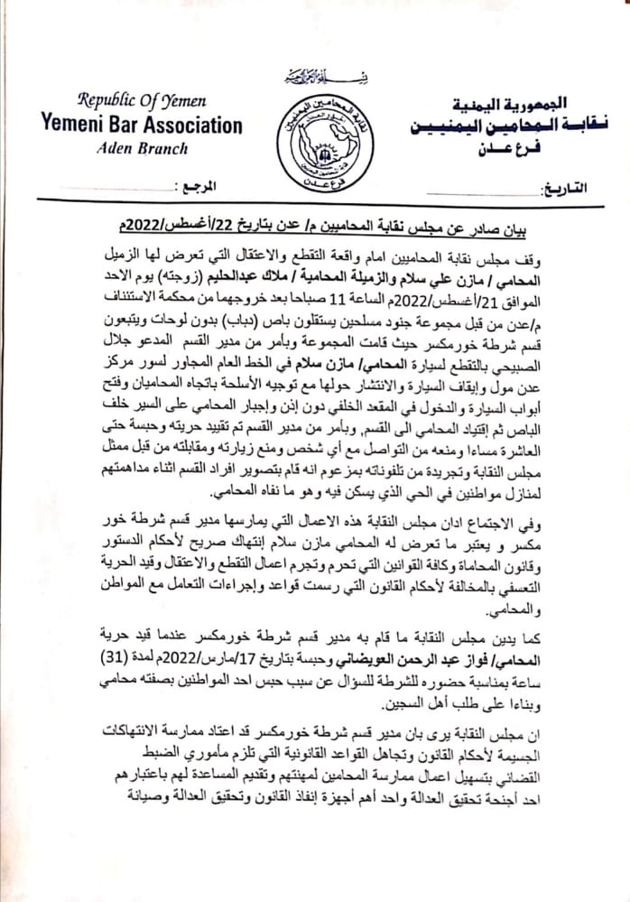 أدان مجلس نقابة المحاميين فرع عدن واقعة التقطع والاعتقال التي تعرض لها المحامي مازن سلام وزوجته المحامية ملاك عبدالحليم، بالاضافة الى تقييد حرية المحامي فواز العويضاني.