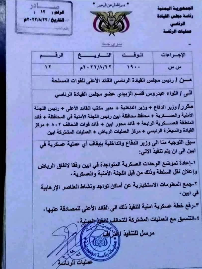 وقال العليمي في التوجيه "سبق التوجيه لوزير الدفاع والداخلية بوقف أي عملية عسكرية في أبين إلى أن يتم إعادة تموضع الوحدات العسكرية المتواجدة في ابين وفقا لاتفاق الرياض وإعلان نقل السلطة، وجمع المعلومات الاستخباراتية عن أماكن تواجد ونشاط العناصر الإرهابية، ورفع خطة عسكرية وأمنية للتنفيذ ذلك إلى القائد الأعلى للمصادقة عليها".