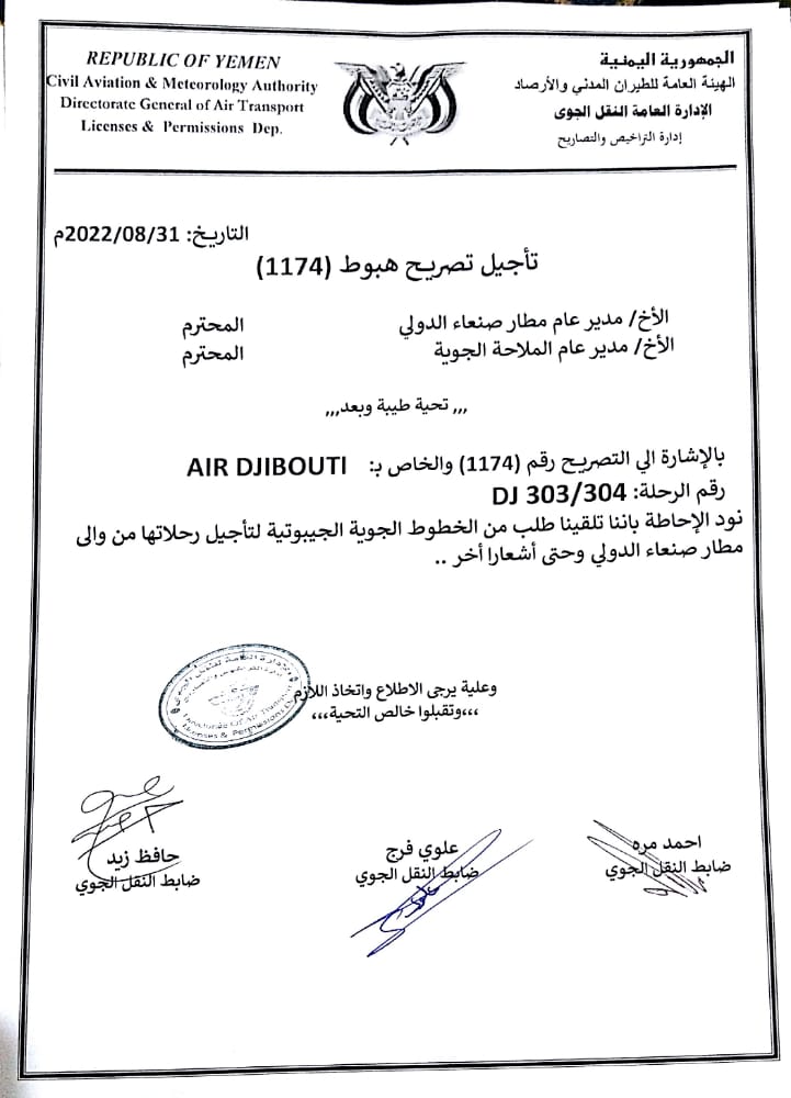 قالت مليشيا الحوثي، إنها تلقت طلبا من الخطوط الجوية الجيبوتية بتأجيل رحلاتها إلى صنعاء حتى إشعار آخر، وفق ماجاء في وثيقة لهيئة الطيران الخاضعة للجماعة.