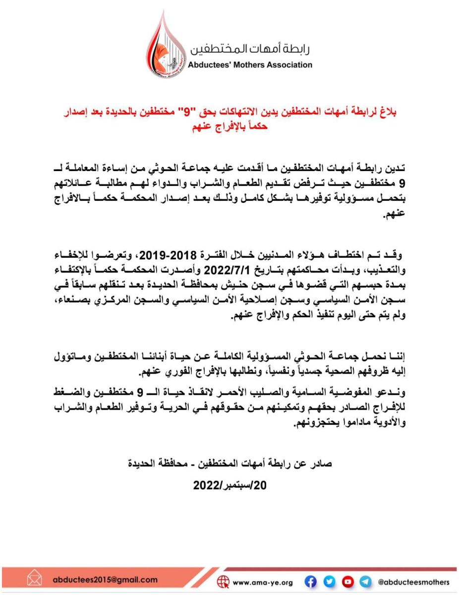 وأشارت الى أن المختطفين التسعة، "تم اختطافهم خلال الفترة 2018-2019، وتعرضوا للإخفاء والتعذيب، وبدأت محاكمتهم بتاريخ 2022/7/1 وأصدرت المحكمة حكماً بالإكتفاء بمدة حبسهم التي قضوها في سجن حنيش بمحافظة الحديدة بعد تنقلهم سابقاً في سجن الأمن السياسي وسجن إصلاحية الأمن السياسي والسجن المركزي بصنعاء، ولم يتم حتى اليوم تنفيذ الحكم والإفراج عنهم."