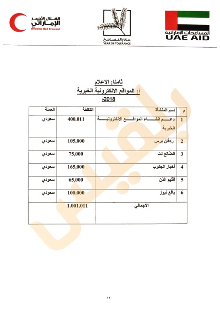 وتم أيضا تخصيص أكثر من ٤ ملايين درهم إماراتي لوسائل إعلام تعمل لصالح الإمارات، وكذلك المنظمات الدولية التي تصدر تقارير مناوئة لممارسات أبو ظبي في اليمن.