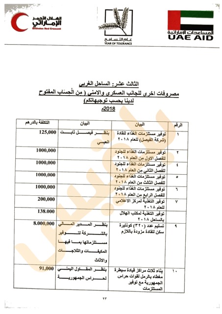 وتضمن التقرير حجم المصروفات، التي أنفقت بالدرهم الإماراتي في الساحل الغربي ومحافظات عدن وتعز ولحج والضالع وأبين وحضرموت.